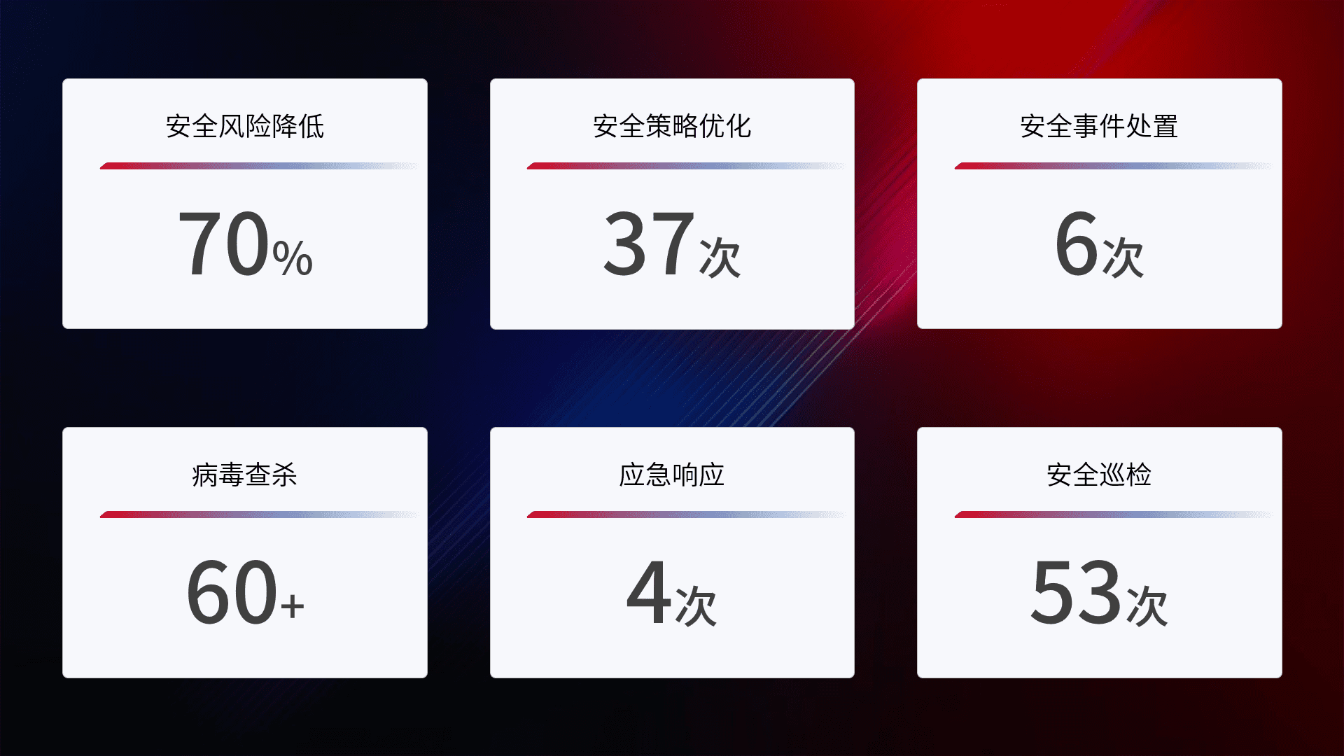 提供全面的安全事件报告体系,,包括处置报告、、周报、、、、季度和年度总结,,,结合持续监控,,,帮助客户深入了解网络安全状况。。